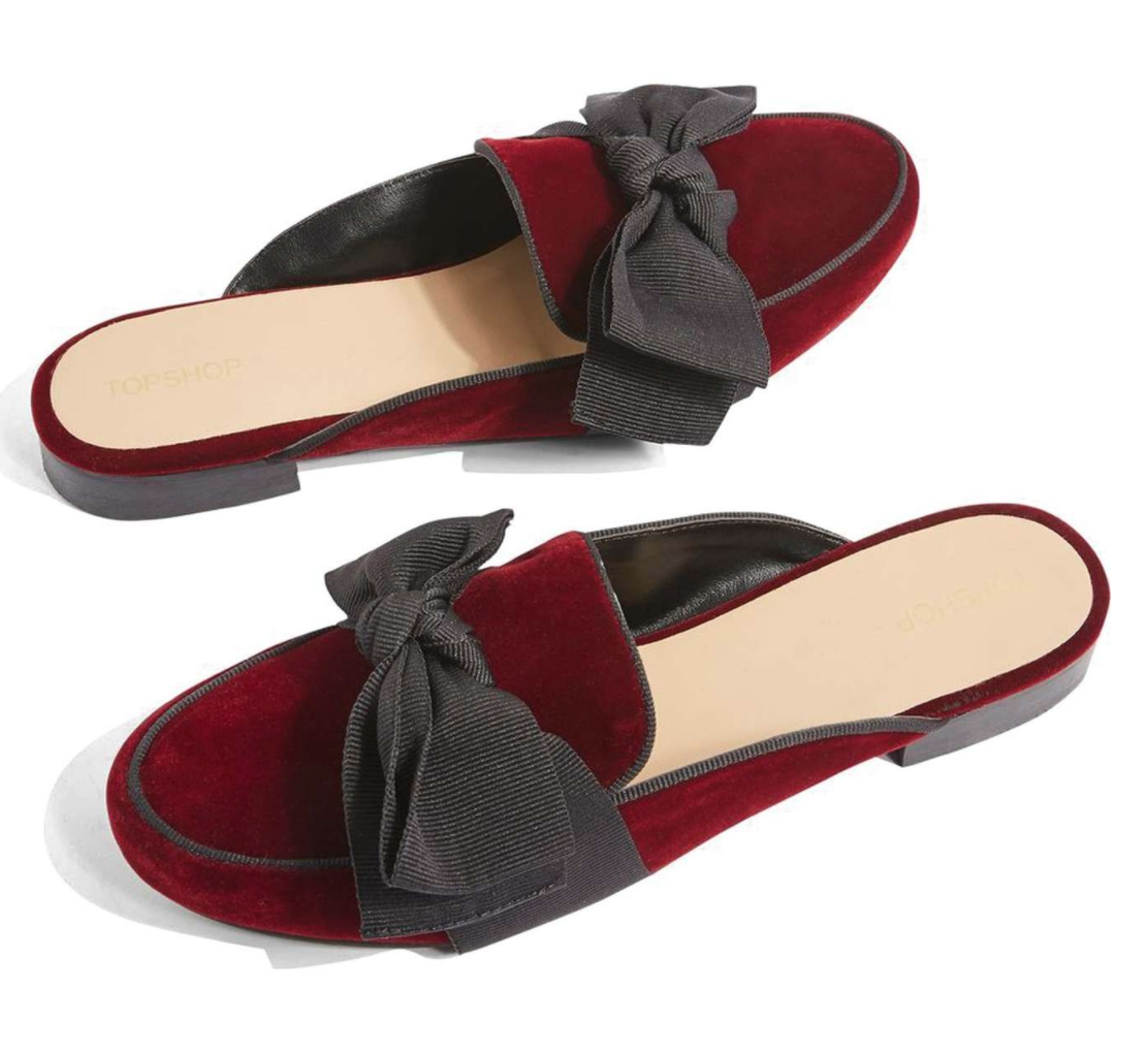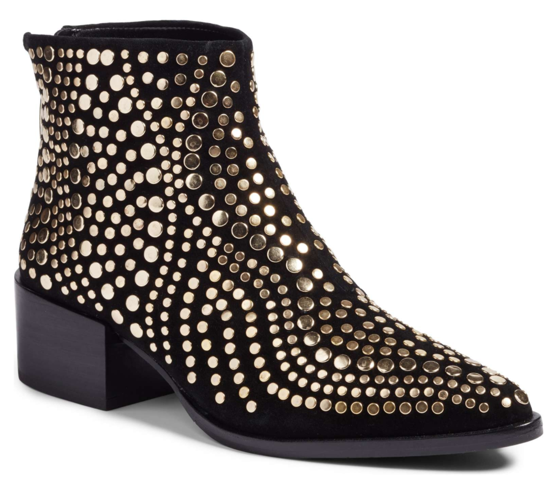 Contrasting textures and colors. Red patent leather? Checked. Brocade and velvet booties? Checked. Studds? But of course!