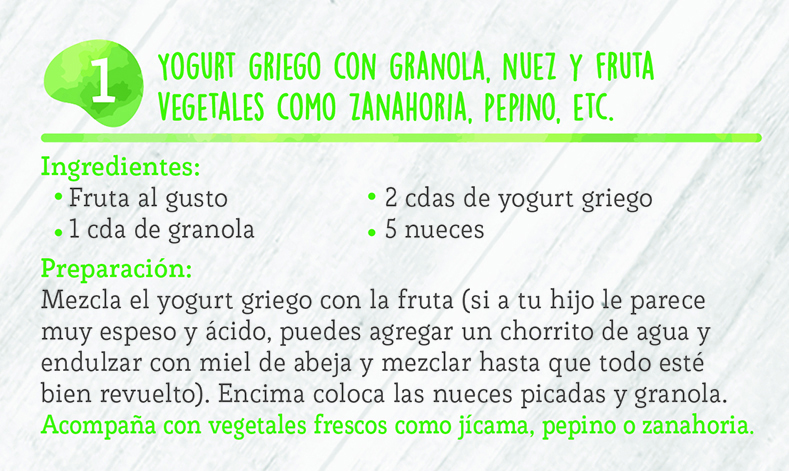 1. Yogurt griego con granola, nuez y fruta + vegetales como zanahoria, pepino, etc.
