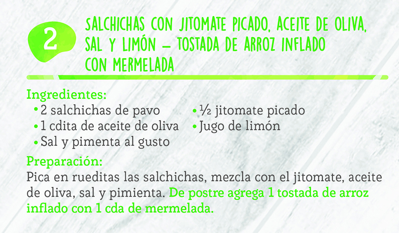 2. Salchichas con jitomate picado, aceite de oliva, sal y limón + tostada de arroz inflado con mermelada