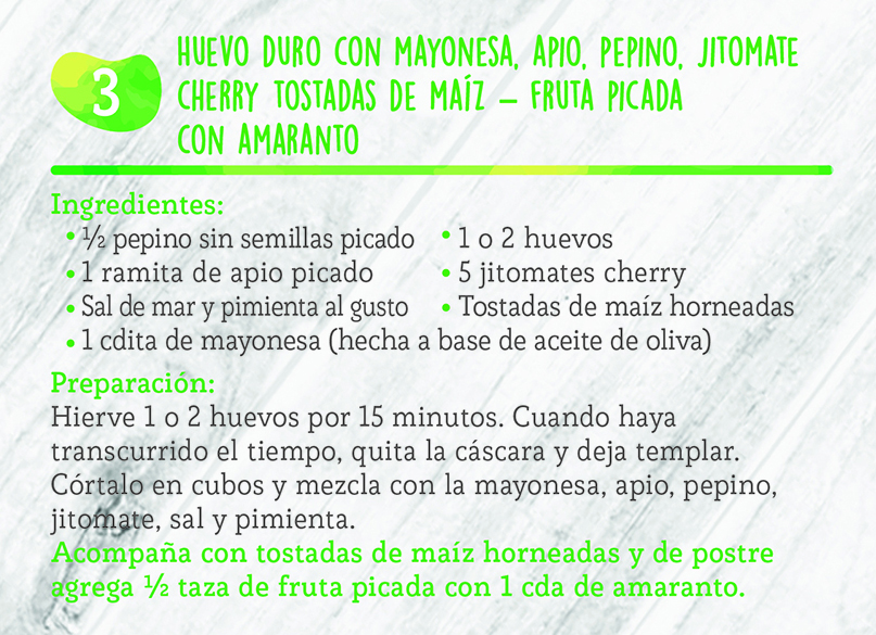 3. Huevo duro con mayonesa, apio, pepino, jitomate cherry + tostadas de maíz + fruta picada con amaranto