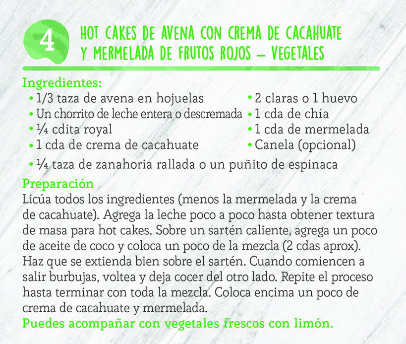 4. Hot cakes de avena con crema de cacahuate y mermelada de frutos rojos +vegetales