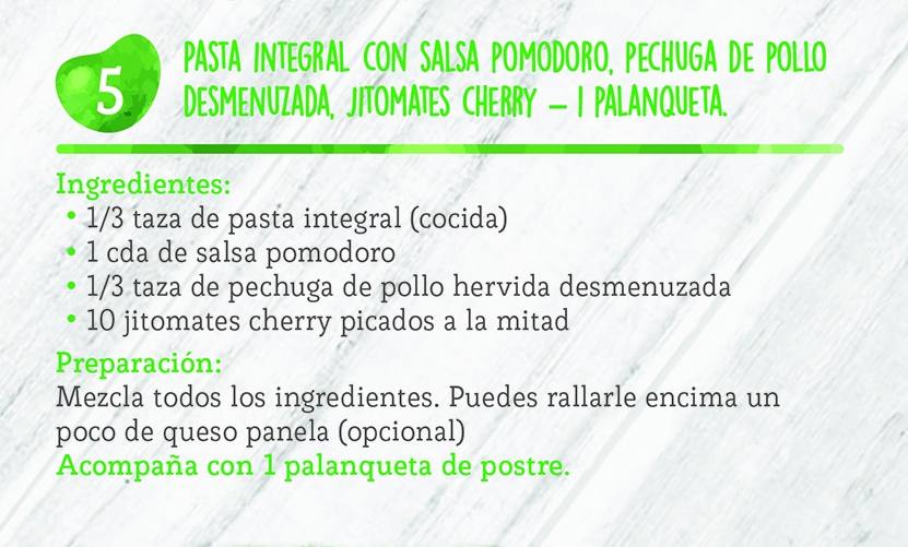 5. Pasta integral con salsa pomodoro, pechuga de pollo desmenuzada, jitomates cherry + 1 palanqueta. (Esta receta es perfecta para tenerla lista para cuando regresan de la escuela o para lunch)