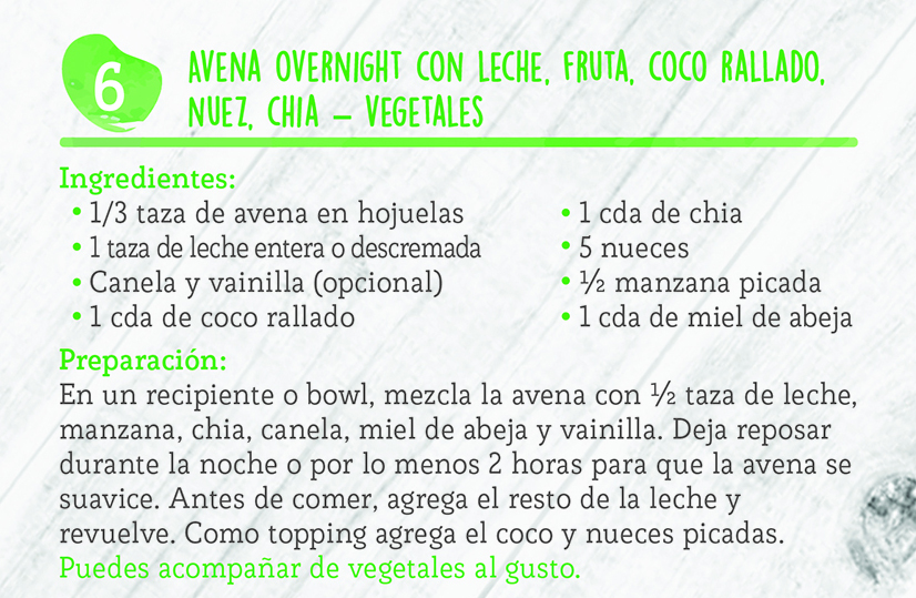 6. Avena remojadas con leche, fruta, coco rallado, nuez, chía + vegetales